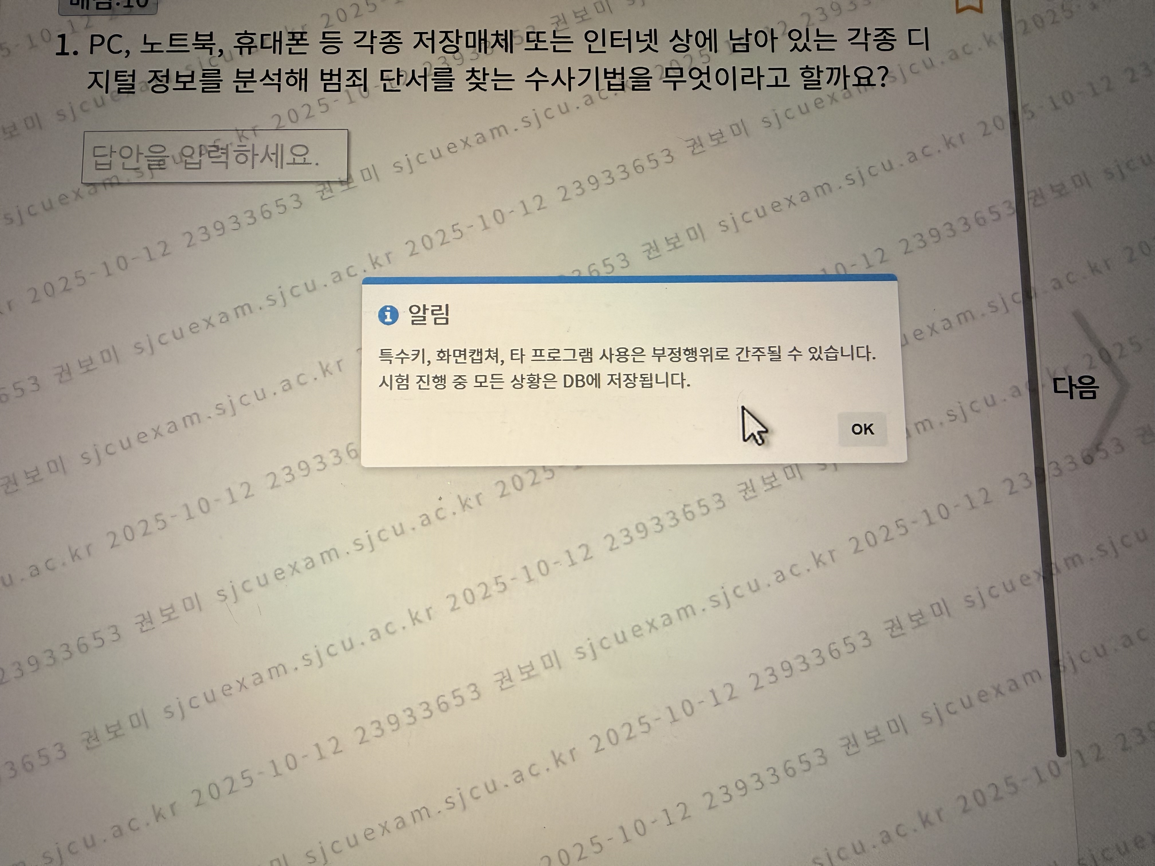 시험도 온라인으로 본다. 온라인으로 보는 시험이라 그냥 오픈북이라고 보면 된다. 위의 사진은 진짜 시험이 아니라 모의 시험 창인데 시험보는 창을 최소화하거나 다른 창으로 넘어가면 무조건 저 경고가 뜨게 되어있다. 그래서 ai 사용을 공개적으로는 막아놨다. 노트북을 하나 더 쓰는건 막을 수 없으므로 ai를 사용하려면 충분히 할 수는 있다. 오픈북이라서 성적대가 대체로 높기 때문에 시험 시간이 굉장히 짧다. 시험문제 20개인데 20분 준다. 암기 과목이면 1문제당 1분도 안 걸리기 때문에 이 시간마저도 충분하다. 그러나 계산이 필요한 과목의 경우 쪼금 시간이 부족하다.