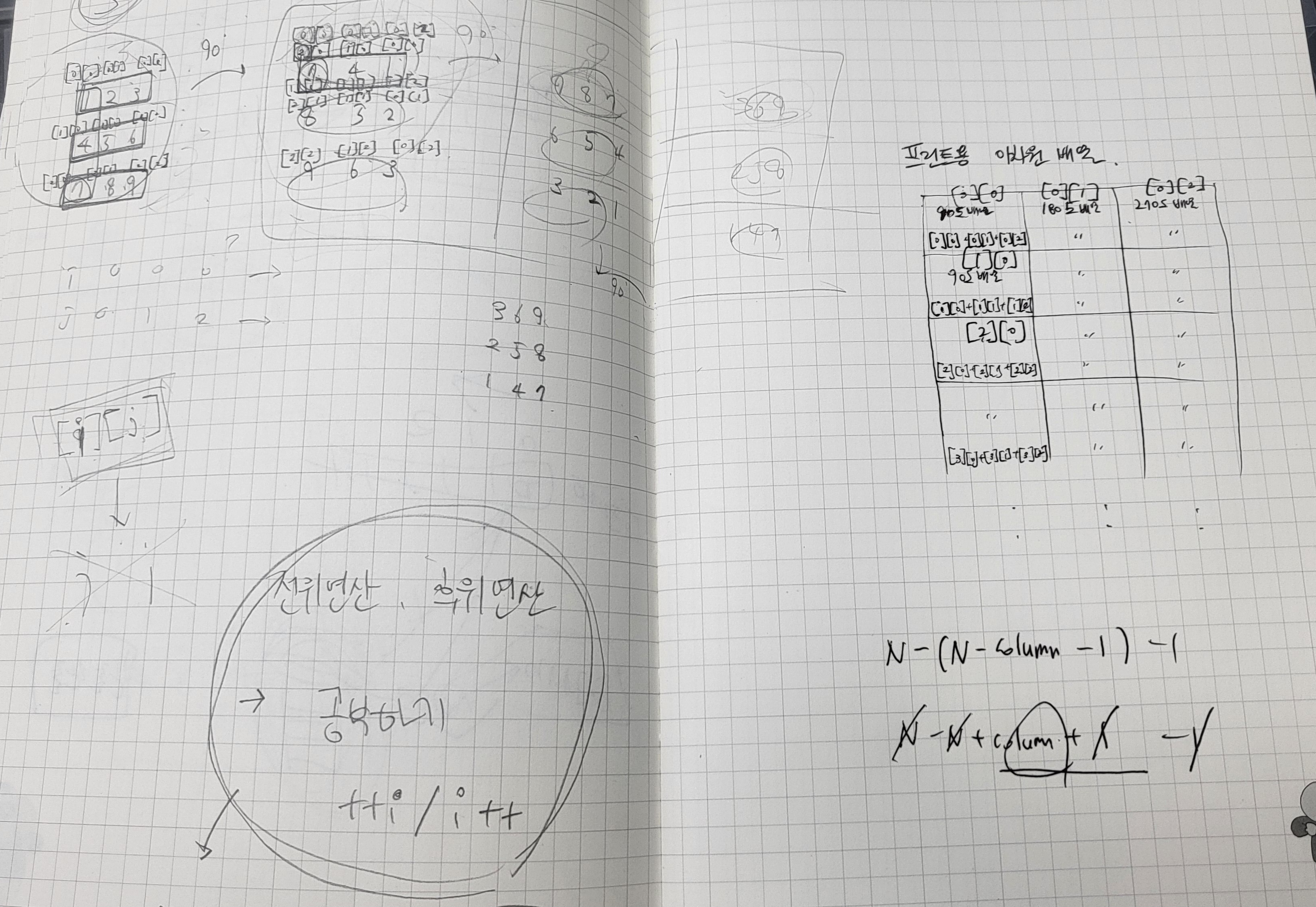 90도[N][N] 짜리 배열을 만들어서 반복문 돌리며 숫자를 집어넣는다. 행과 열의 문자와 순서를 전부 뒤집어야 한다. 180도, 270도 배열도 마찬가지.