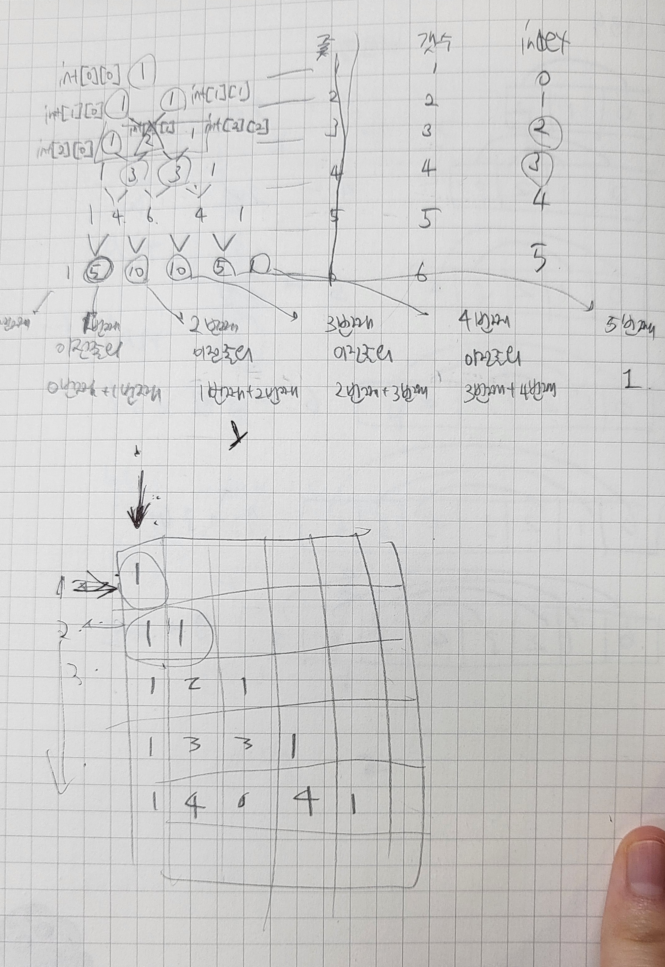 이게 이차원 배열에 파스칼의 삼각형을 넣으면 맨 아랫줄은 모든 칸이 다 차는데 반해 윗줄로 올라갈수록 배열 뒷칸들은 비어있게 되니 이차원 배열로 하는게 맞나.. 싶었는데 다른 사람들도 다 이차원 배열로 풀었다. 처음에는 한줄 한줄 매번 배열을 새로 만들까 생각했는데 그것도 별로고.. 배열 두개만 만들어놓고 이전 배열이랑 (지금 배열의 값을 계산하는데 이전 배열이 필요하니까) 지금 배열만 담고 계속계속 배열 비우고 새로넣고 하면서 할까 했는데 그것도 비슷하게 칸이 낭비될것 같고.. 어 어쨌든 그냥 이차원 배열이 그나마 가장 나은것같다!!
