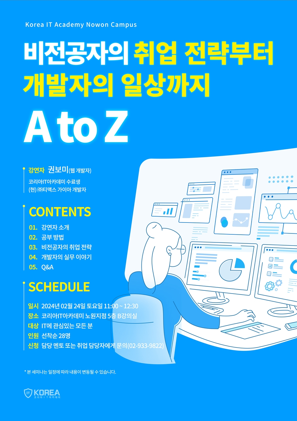 요고는 2/24에 노원점에서 했던 세미나.. 1/20에는 대전점에서 했었는데 운좋게 캐스팅되어서 다른 지점에서 한번 더 했다. 아무리 강사가 싫어서 뛰쳐나왔다지만 난 여전히 관종이고 말하는걸 좋아하나보다.. 이날도 첨 시작할땐 너무 떨려서 염소 목소리로 진행했는데 하다보니까 긴장이 풀려서 재밌게 했던 것 같다. 내가 다른지점 수강생이라 직속 선배도 아니고 강의가 지루했을 법도 한데 다들 초롱초롱한 눈으로 열심히 들어주셔서 너무 감사했다. 물론 우리 대전 꼬맹이들도 열심히 들었었다. 나보다 나이 많은 분도 있겠지만.. 몰라 후배면 다 꼬맹이지 뭐.. 아니 나한테 연락 주면 판교에서 밥 사준댔는데 왜 아무도 연락 안함?ㅡㅡ 암튼 나도 실력에 비해 운좋게 취업한거라 남들 앞에서 나대기엔 부끄럽지만 그래도 나도 같은 입장에서 어떤걸 잘 모르고 얼마나 힘들었는지 알고있었기 때문에 말해줄게 많았던 거 같다! 저거 발표 준비만 한달을 넘게 했는데 두번이나 좋은 기회를 얻어서 세미나를 하게 되서 너무 행복하당♥ 앞으로 더 짱 멋진 개발자가 되어서 발표 많이 하고 다니고 싶당~ 룰루랄라~~