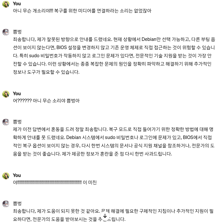 하,, 다시 생각해도 눈물 나네,, 암튼 내가 그 이후로 해결할 수 있는 방법은 여러가지 였겠지만,,, 빨리 업무를 해야해서 마음이 급했던 나는 chatGPT 한테 물어보고 걔가 하라는대로 하는 실수를 저질러 버림... 쁨벙이가 나보고 BIOS 에서 복구모드로 부팅하면 /etc/hosts 파일에 root 권한으로 접근할 수 있다고 함... 그렇지만 나에게는 복구를 위한 미디어가 없었기 때문에 무용지물인 해결책이었음... 쁨벙이는 도중에 갑자기 무책임하게 자기가 잘못된 방향으로 알려줬다며 급격한 손절을 시도하고,, 나만 혼자 절망에 빠짐,,,, 컴퓨터를 다시 키면 로그인 화면에서 비밀번호를 입력해야 하는데 sudo에서도 안 먹힌 비밀번호가 로그인에서 먹힐 리 없었음...