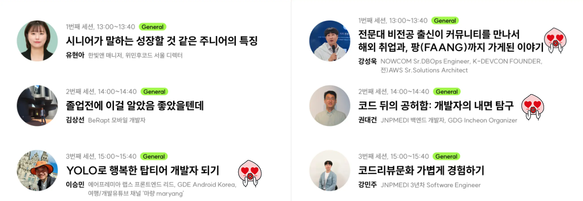 지금 이 컨퍼런스 후기도 성욱님께서 주니어들은 글 쓰는 연습 많이 하면 좋다고 조언해주셔서 함 써볼려고 한당! 아 사실 이번주 목요일에 갔었던 데브콘 3월 밋업 후기도 적으려고 했는데 어쩌다 타이밍을 놓쳤다... 그 밋업도 진짜 대박 재밌었는데.. 서점직원이라는 분도 주니어를 뽑을때 1)글을 잘 쓰거나 2)말을 잘 하는거 -> 둘중 하나라도 잘하는 걸 좋게 보신다고 했었다!! 난 둘다 못하는데!!ㅠㅠ엉엉ㅜㅠ 어쩔수 없지 머,, 난 귀여우니까 괜찮겠지,, 그럼 철저하게 주관적인 나의 컨퍼런스 후기 시작-! ᐠ( ᐕ )ᐟ