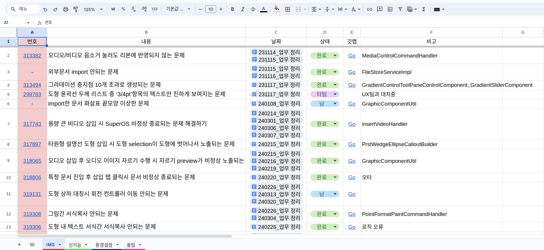 번호에 있는 IMS 번호를 누르면 해당 사이트로 연결되어서 QA가 남겨준 글과 내가 처리한 글 등 히스토리를 한꺼번에 볼 수 있다. 날짜는 @ <- 이 골뱅이를 치고 업무일지 제목을 적으면 자동으로 연결되는 서비스를 구글에서 제공한다. (사실 이 기능때문에 구글로 업무정리 하기로 결정함) 그래서 업무정리 url을 복붙할 필요가 없어서 편하다. 암튼 저걸 누르면 해당 IMS를 처리했을때의 자세한 내용을 볼 수 있다. 상태에서 '타팀'은 다른 팀으로 넘기기로 한 이슈이고, '남'은 내가 아니라 팀장님이나 다른 형님들이 해결하신건데 너무 중요해서 나도 기억하려고 적어놓은 것이다. Go를 누르면 해당 MR을 올린 깃랩 페이지로 넘어간다. 그리고 가끔 '그 이슈 해결했던 파일 이름이 뭐였더라?'만 궁금할 경우 깃랩 커밋을 안 보고도 빠르게 확인할 수 있도록 비고 란에 파일 이름도 적어두었다. 그래서 이제부터는