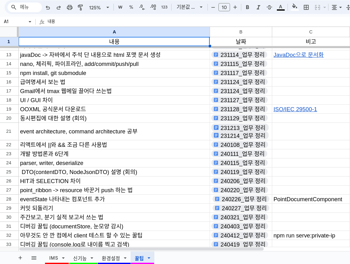 사실 우리 회사에서 만드는 것도 오피스 제품이라 거기다가 하고 싶었지만,, 일반 대중이 아니라 기업 상대로 제품을 팔고 있는 상태이고, 직원들에게 제공되는 앱도 수시로 버전이 바뀌고 매번 새로 배포되어서 거기에 하기는 불안했다. 근데 우리 제품이 좀 안정적으로 제공된다면 그걸 쓰는게 훨씬 편할 것 같다. 왜냐면 문서를 DB에 저장하므로 개별 문서에 있는 내용들도 한꺼번에 검색이 가능하니까!! 지금 내가 업무일지 적는 Google 문서에서 만약 문서 통합 검색만 가능하다면 다 해결될 문제인데.. 귀찮;; 암튼 나는 구글 스프레드시트를 켜서, 일단 시트를 1)IMS 2)신기능 3)환경설정 4)꿀팁 이렇게 네가지로 나누었다.