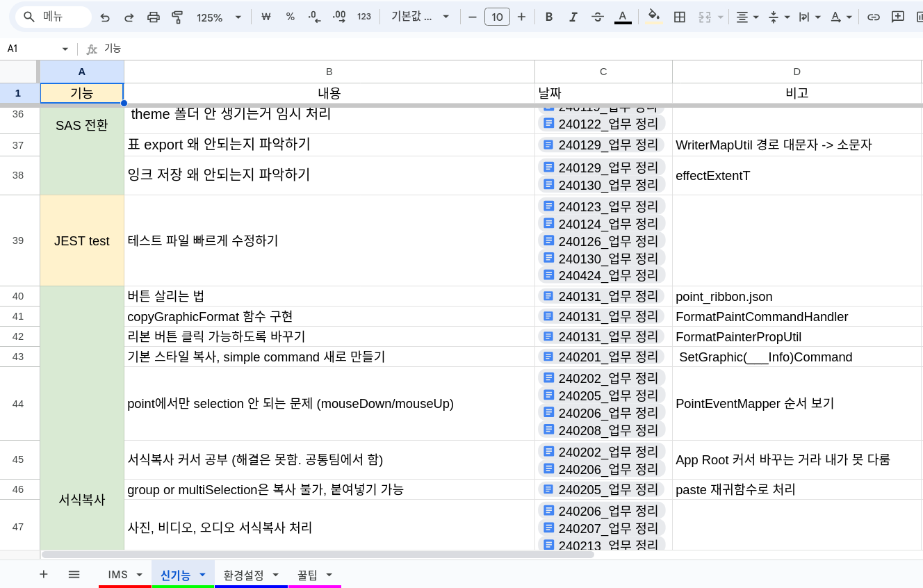이건 신기능 시트.. 신기능 + 팀에서 다같이 하는건데 IMS로 구분하기 애매한거 그냥 몰빵해놓은 것이다.