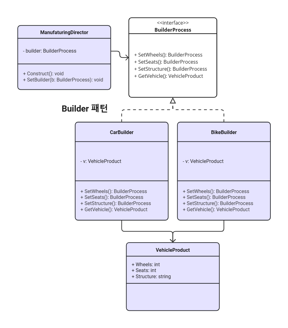 디렉터는 SetBuilder로 빌더 객체 설정하고, Construct를 호출해서 Car 또는 Bike 각 빌더의 메서드를 체인으로 호출해 객체를 완성함. GetVehicle 메서드를 호출하여 최종적으로 구성된 VehicleProduct를 가져옴.