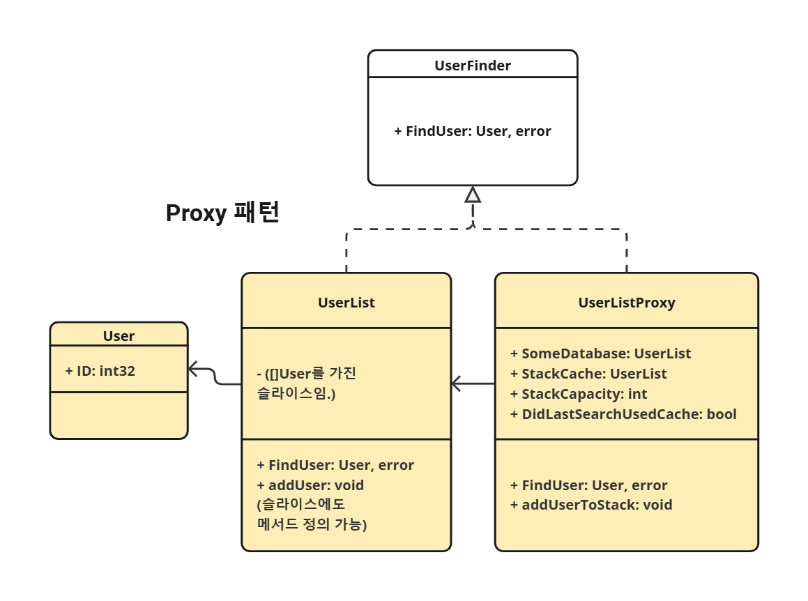 프록시 객체 UserListProxy는 캐싱을 사용하여 성능을 최적화하는 역할을 함. 실제 객체인 UserList를 감싸며, FindUser 요청을 가로채 캐싱 로직을 추가함. 검색 요청을 먼저 캐시(StackCache)에서 확인하고 없으면 DB(SomeDatabase)에서 검색함. 그리고 DB에서 검색한 결과를 캐시에 추가함.