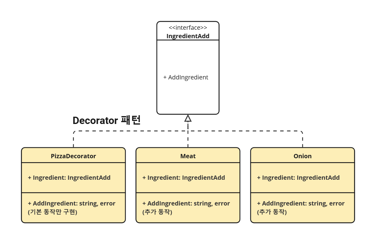 컴포넌트를 감싸며 기본 동작에 추가 기능을 동적으로 부여함. 다른 IngredientAdd 객체를 래핑(포함)하여 동작을 확장함. 피자에 meat를 추가함. Onion 구조체를 만들어 동일하게 쓰면 피자에 onion을 추가할 수도 있음.