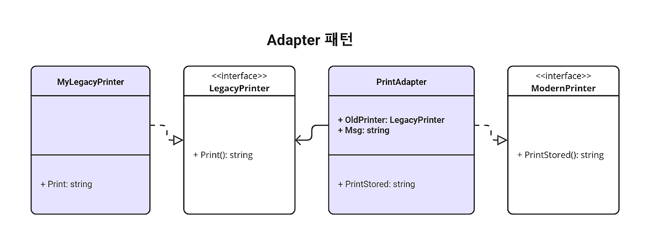 호환되지 않는 인터페이스를 연결해주는 패턴. 기존에 사용중인 구조체를 수정하지 않고도 새로운 인터페이스와 함께 사용할 수 있도록 중간 다리 역할을 함.