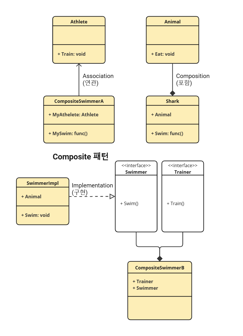 CompositeSwimmerB는 Trainer와 Swimmer 인터페이스를 내장하여 기능 제공